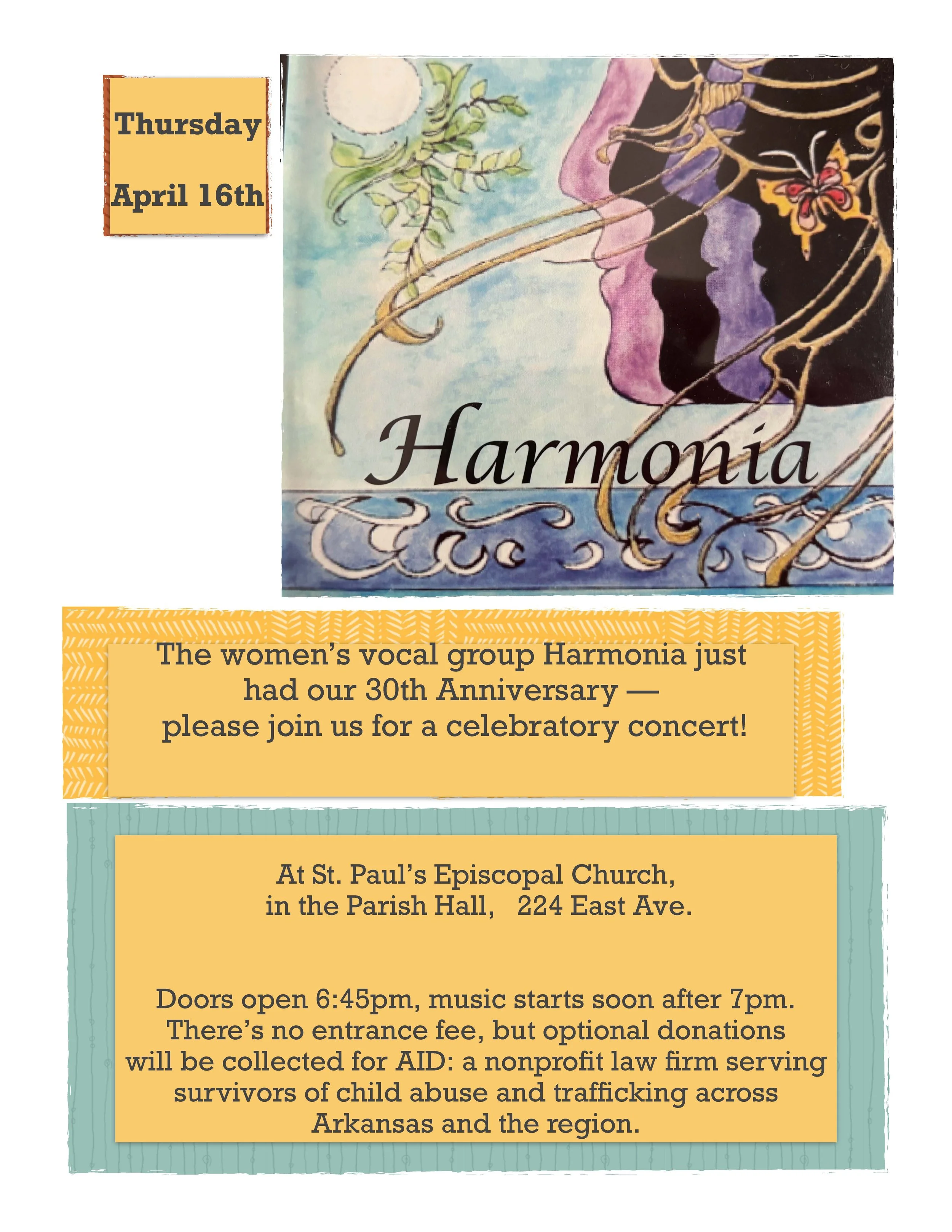 Join Harmonia, a women’s vocal ensemble, for a special 30th anniversary concert on Thursday, April 16 in the Parish Hall at St. Paul’s. Doors open at 6:45 p.m., with music beginning shortly after 7. The concert is free to attend, with a donation basket benefiting AID, a nonprofit law firm serving survivors of trafficking and child abuse across Arkansas and the region. Come enjoy an evening of beautiful, healing music while supporting an important cause.